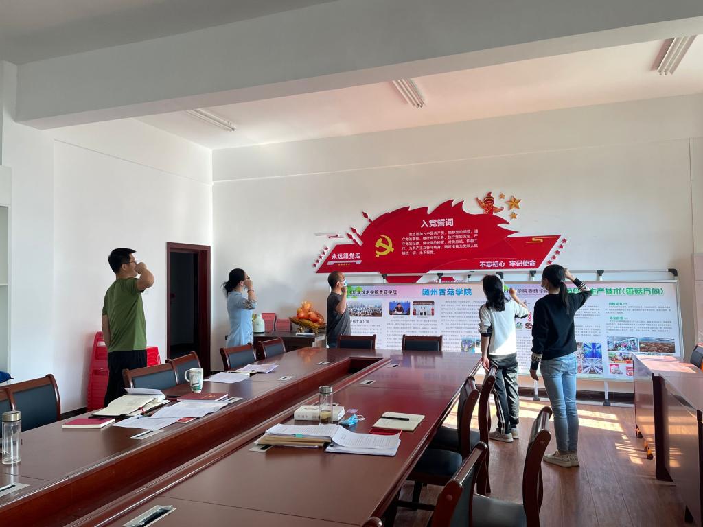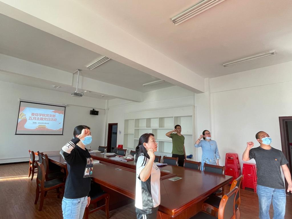 2022年5月6日,香菇学院支部开展5月分支部主题党日活动,活动中,由5月份过政治生日的刘立军同志带领大家重温入党誓词。