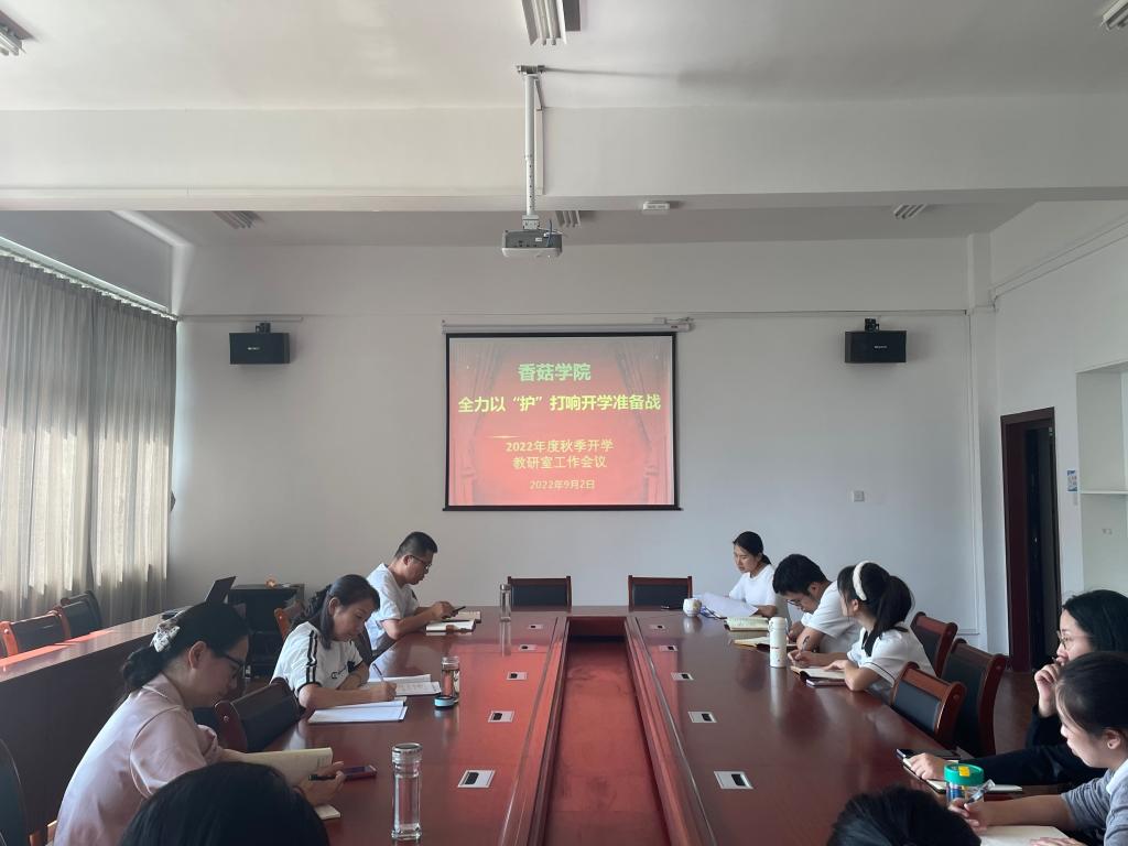 为推动新学期教学任务开展,落实学校及相关部门运行要求,香菇学院教研室于2022年9月2日召开了2022-2023学年第一学期首次教研活动,主题为:全力以“护”打响开学准备战。参与人员为香菇学院全体教师。本次活动由教研室主持,活动议程为: