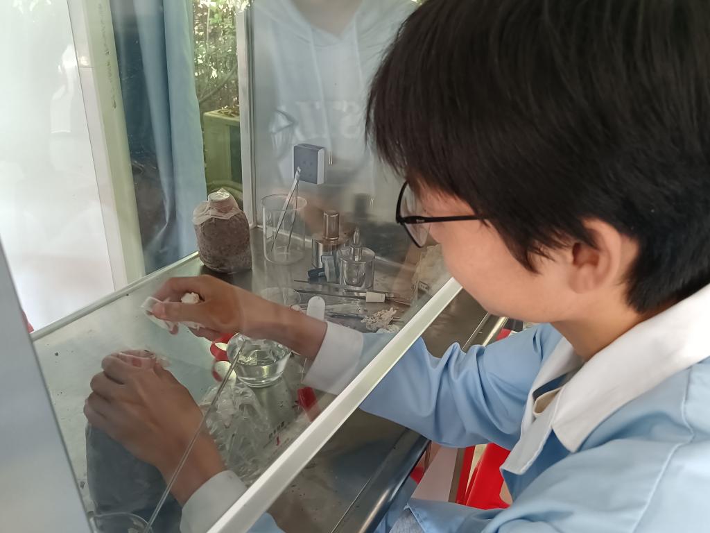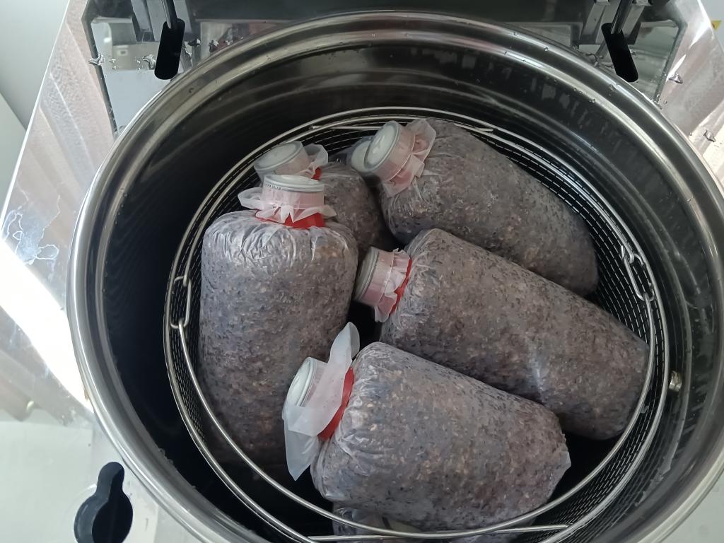 图为学生将菌包放入灭菌锅待灭菌