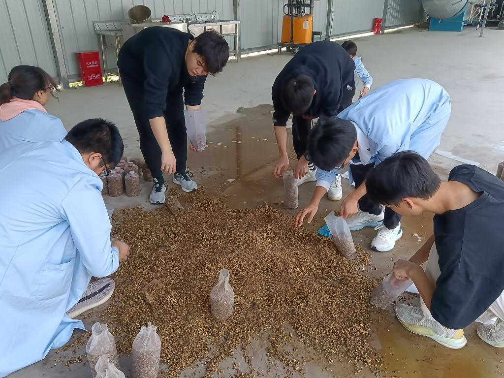 图为学生将混好的栽培料装袋