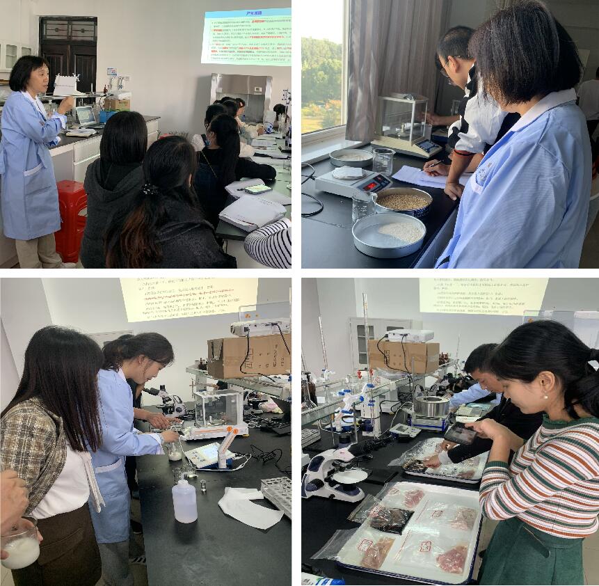 华农黄文教授团队分别开展了粮食脂肪酸值的测定、果蔬中汁液冰点的测定、肉类产品的贮藏保鲜方式等 食品理化检测分析 相关的实训项目内容。在教学示范中,黄文教授团队运用幽默的语言表达、循循善诱的内容引导,与学生情感共鸣,激发了学生们与生俱来的好奇心,不动声色中完成了从理论到实践操作的过渡,最后通过实操演示一步步引导学生动手操作,并反复练习和总结规律。同学们的专业理论水平和实际操作能力得到了提高,老师们也收获颇丰。