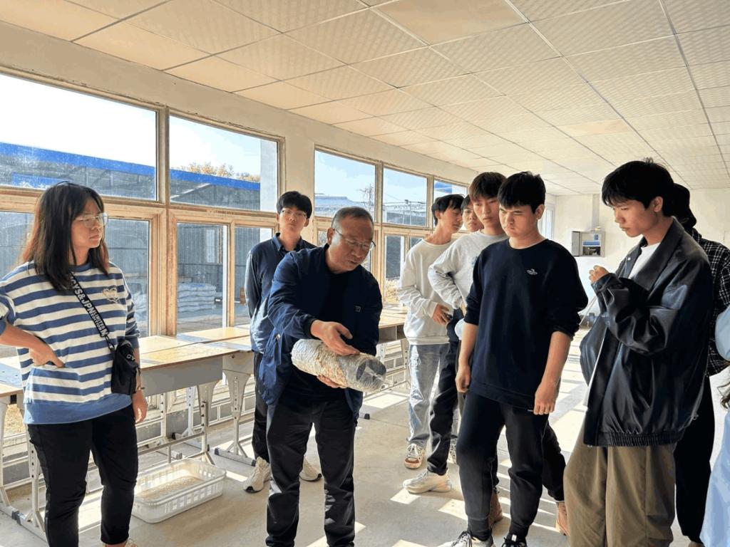杨老师指出,春栽香菇菌棒在越夏期间面临着高温、高湿等不利因素,这些因素可能会导致菌棒生长受阻、产量下降甚至腐烂。因此,他特别强调了合理控制棚室环境、适时通风降温、科学水分管理等关键技术的重要性。通过生动的案例和实地演示,并就如何根据不同地区的气候特点调整策略提出了建议。杨老师不仅向同学们无条件的分享核心生产技术,同时与旁听的在校老师们互动交流,针对生产实践中遇到的问题提供专业、实用的解答。