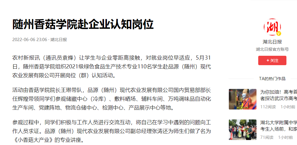 湖北日报—今日头条报道香菇学院赴企业认知岗位活动