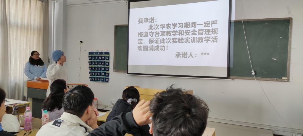 会上,教学办袁主任、张主任对此次活动的内容做出了解释说明,现场发布最新课表,并对同学们的学习情况提出了明确要求。学工办刘主任带领大家学习安全协议,对在华中农业大学学习生活期间的日常管理进行了强调说明。最后,王琳院长做了动员讲话,全体同学现场宣誓,严格遵守各项纪律要求,并签订了安全协议书。