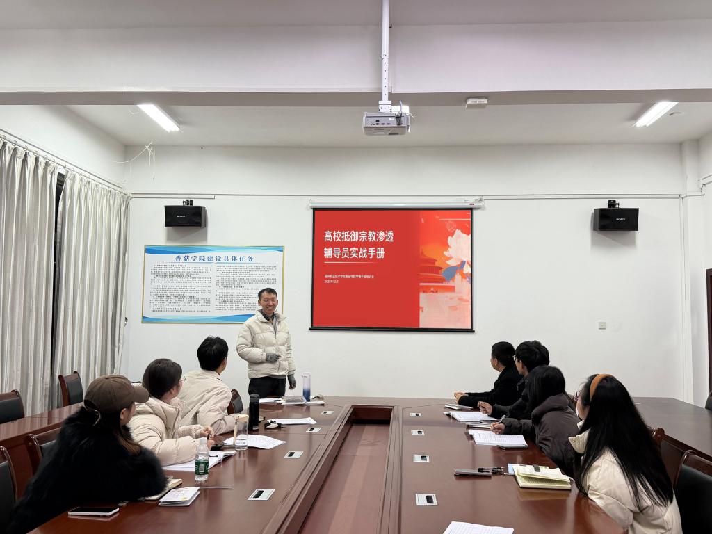 为深入贯彻党的教育方针,坚决抵御和防范宗教向校园渗透,提升辅导员队伍的政治鉴别力与工作实战能力,2025年12月14日,香菇学院学生工作办公室组织全体辅导员开展了“高校抵御宗教渗透”专题培训会。