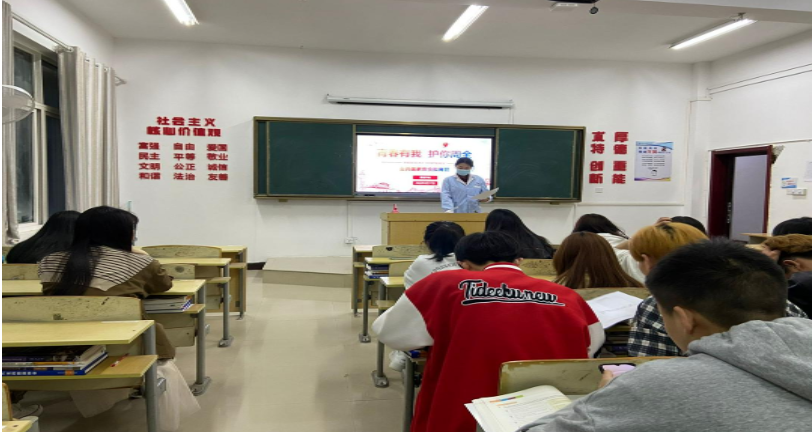 2022年4月18日,在香菇学院教室,由李陆萍老师带领21级食品1班团支部学习党的青年运动史,开展国防教育。