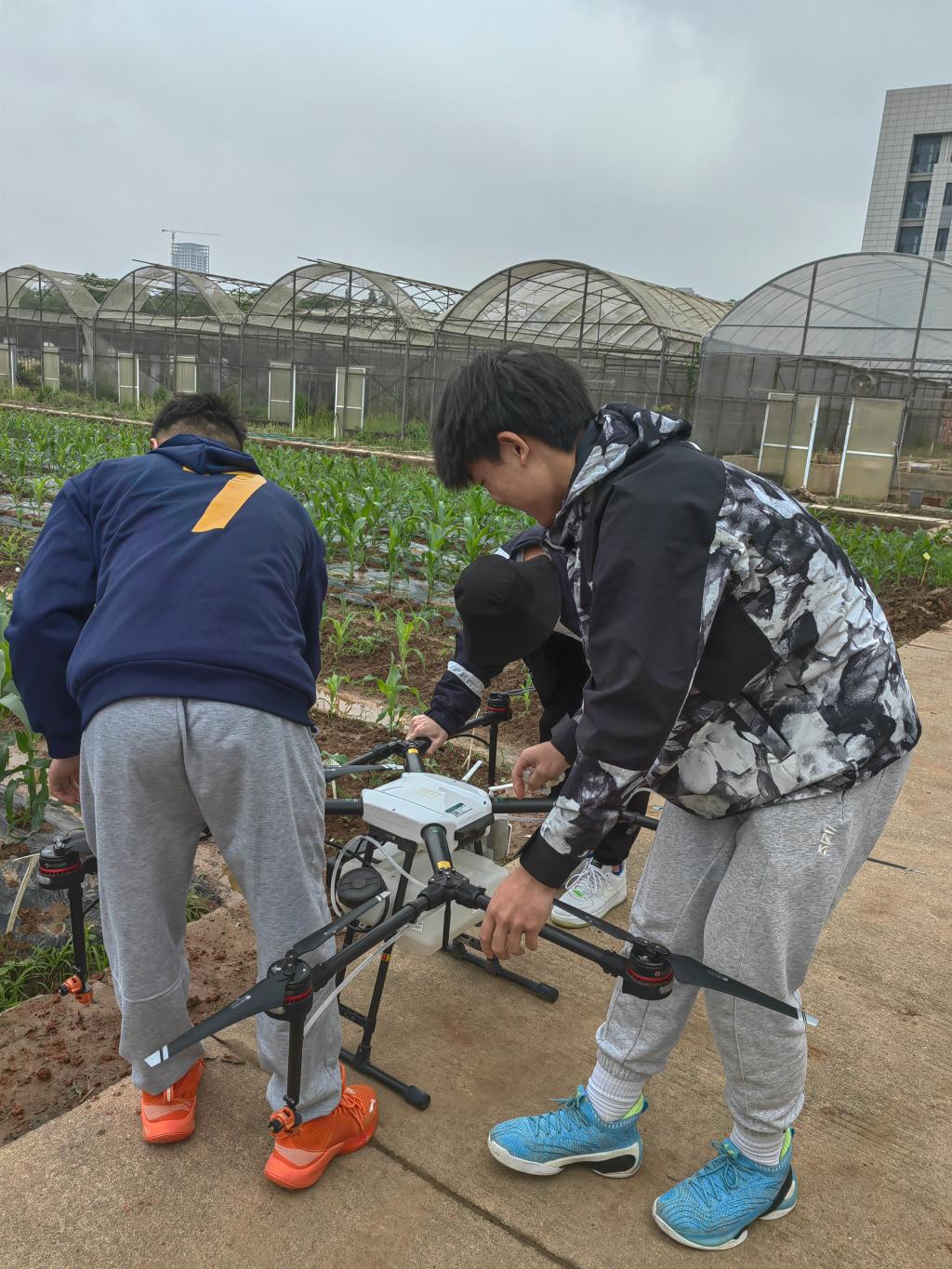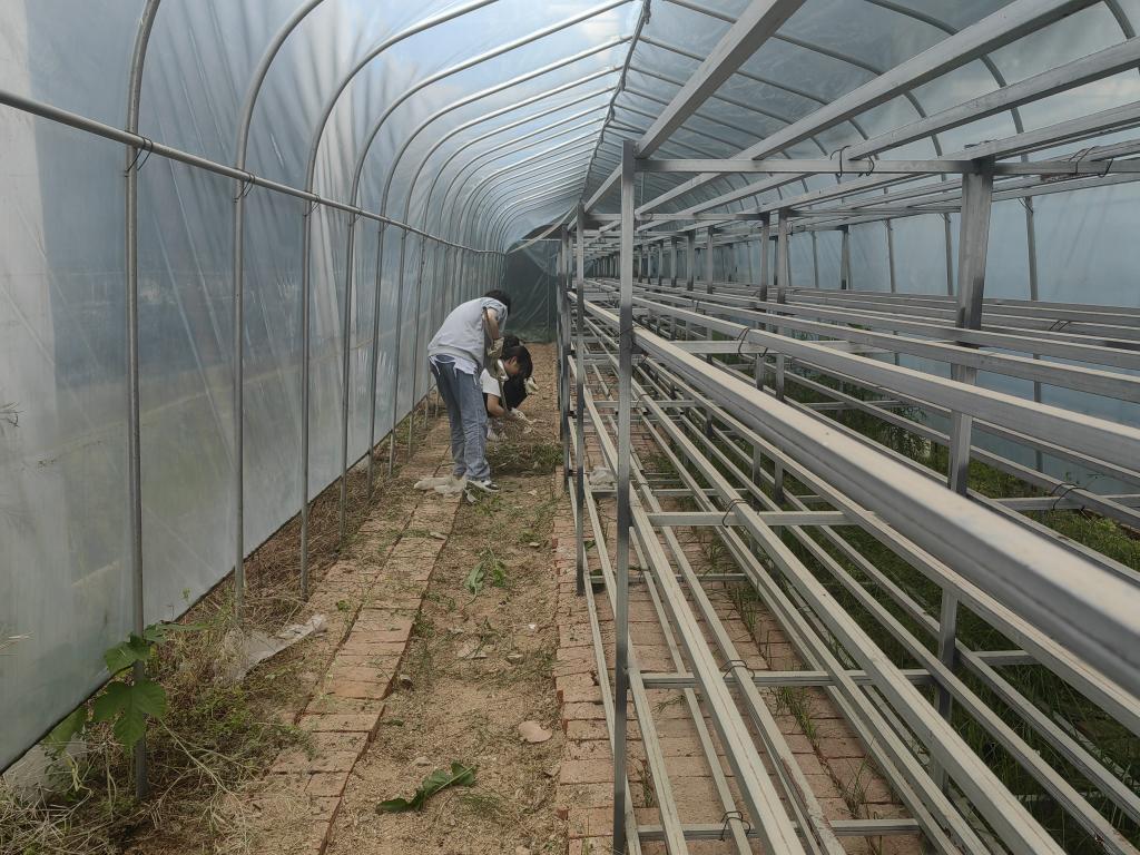 在田间地头,志愿者们为菇棚清理杂草,在专业人员指导下使用操纵现代农机为作物灌溉、施肥,协助做好春耕备耕工作。