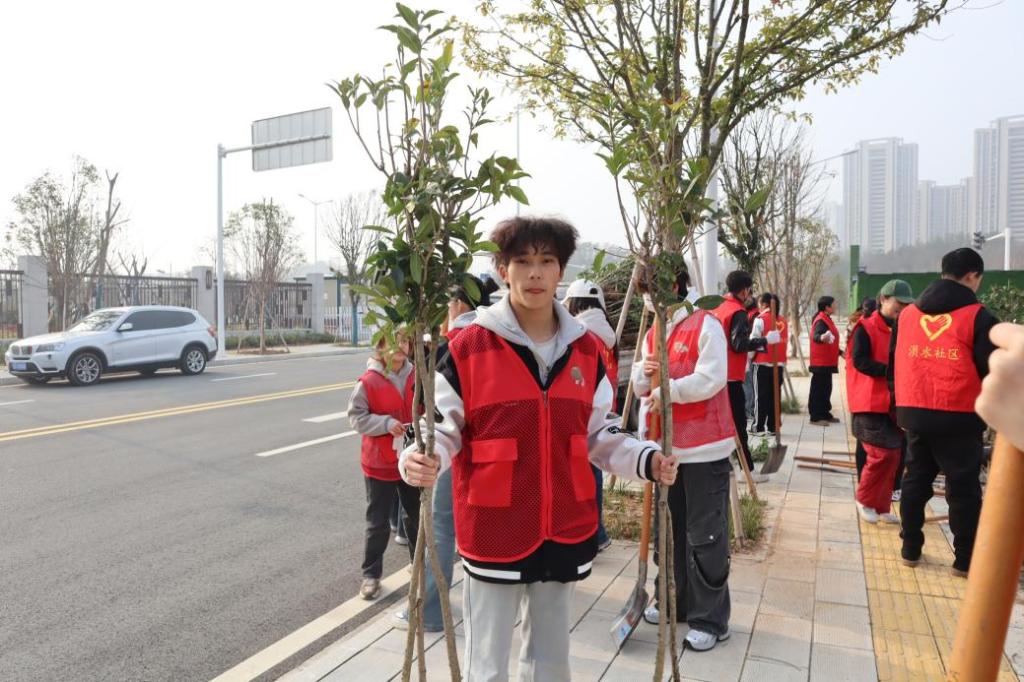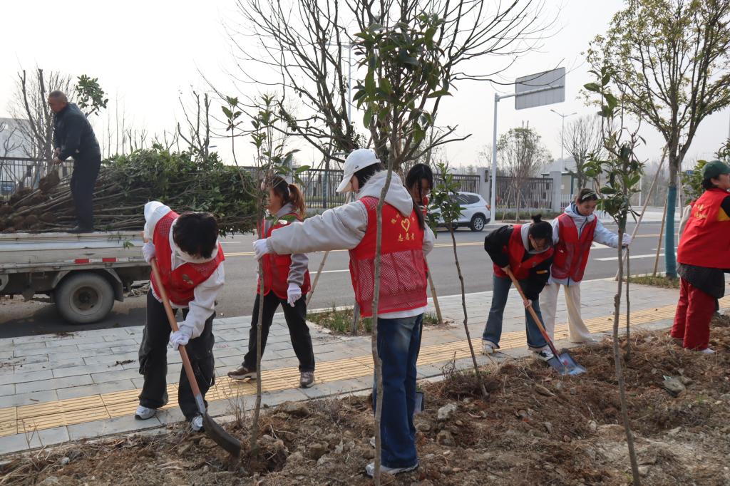 活动现场,志愿者们身着红色马甲,与社区工作人员分工协作,挥锹挖坑、扶苗培土,各个环节井然有序。尽管春寒未褪,但同学们热情高涨,干劲十足。经过两小时的辛勤劳作,百余株树苗在院区旁“安家落户”,错落有致的树苗迎风挺立,为初春增添勃勃生机。