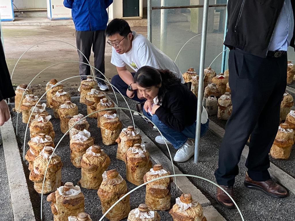 察看桑黄菌棒长势——湖北森源生态科技有限责任公司