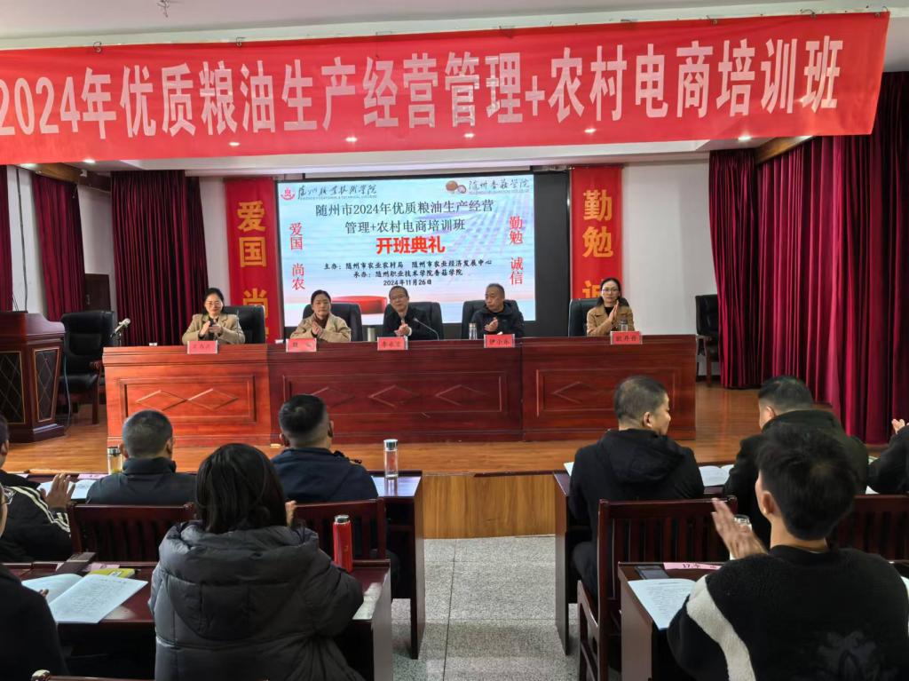 2024年11月26日,由随州市农业农村局、随州市农村经济发展中心联合主办,随州职业技术学院香菇学院承办的全市2024年优质粮油生产经营管理+农村电商培训班在华夏宾馆隆重开班。本次培训旨在提升农民和农业企业管理者的对于优质粮油生产方面的业务技能,以及利用现代电商平台推动地区粮油产品的销售和品牌建设。