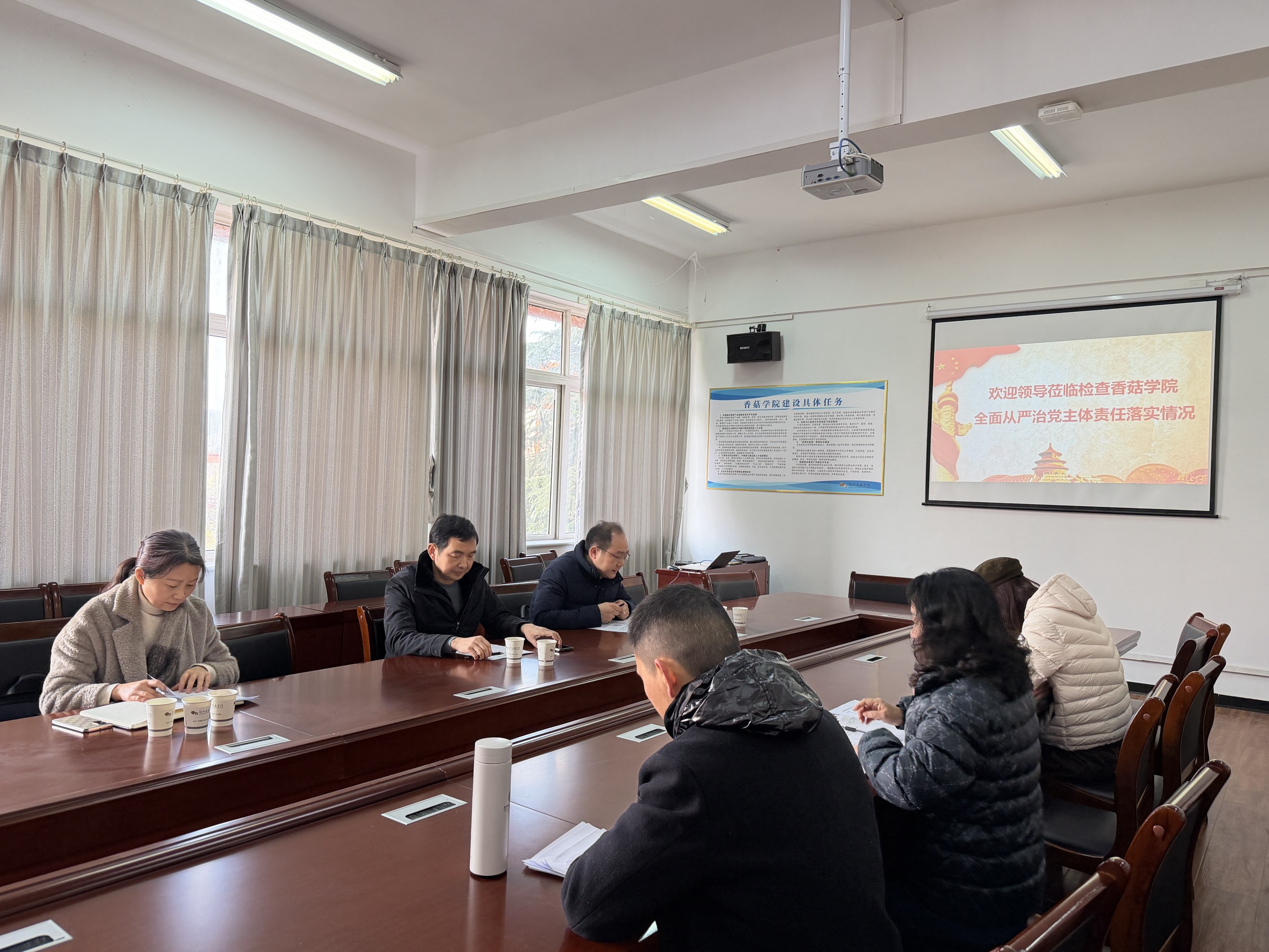 12月29日,学院党委书记李建伟带带队到香菇学院开展落实全面从严治党主体责任监督检查工作。香菇学院执行院长王琳代表学院党总支,从党风廉政建设主体责任和监督责任落实情况、思想文化及意识形态工作、廉政风险防控体系建设、“三重一大”决策制度落实等五个方面,详细汇报了2025年度全面从严治党工作的具体举措和成效。