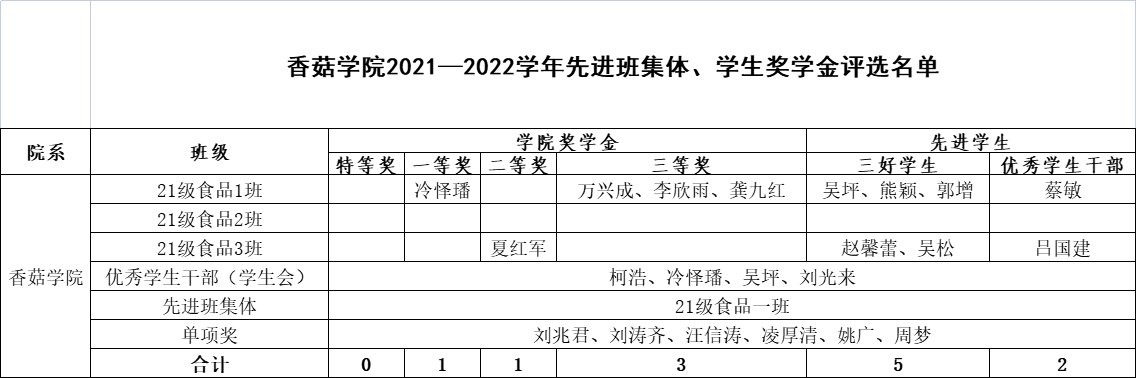 为表彰先进、树立典型,鼓舞和激励广大学生积极进取、奋发向上、提高自身综合素质,营造良好学风和校风。按照《随州职业技术学院学生奖励及实施办法》,香菇学院于2022年9月27日开展2021-2022学年学生评优评先工作。经学生本人申请,班级评议小组评议、辅导员评议审核和学工办评议审核,学院党政联席会评审,拟推荐冷怿璠等5名学生获得“学院奖学金”;吴坪等5名学生获得“三好学生”称号;柯浩等6名学生获得“优秀学生干部”称号,刘涛齐等6名学生获得“单项奖”,21级食品1班获得“先进班集体”称号,现予以公示。