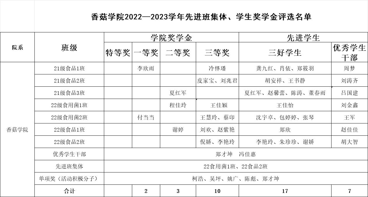 为表彰先进、树立典型,鼓舞和激励广大学生积极进取、奋发向上、提高自身综合素质,营造良好学风和校风。按照《随州职业技术学院学生奖励及实施办法》,香菇学院于2023年9月20日开展2022-2023学年学生评优评先工作。经学生本人申请,班级评议小组评议、辅导员评议审核和学工办评议审核,学院党政联席会评审,拟推荐李欣雨等15名学生获得“学院奖学金”;李艳玲等17名学生获得“三好学生”称号;胡大智等7名学生获得“优秀学生干部”称号,柯浩等5名学生获得“单项奖”,22级食用菌1班、22级食品2班、获得“先进班集体”称号,现予以公示。