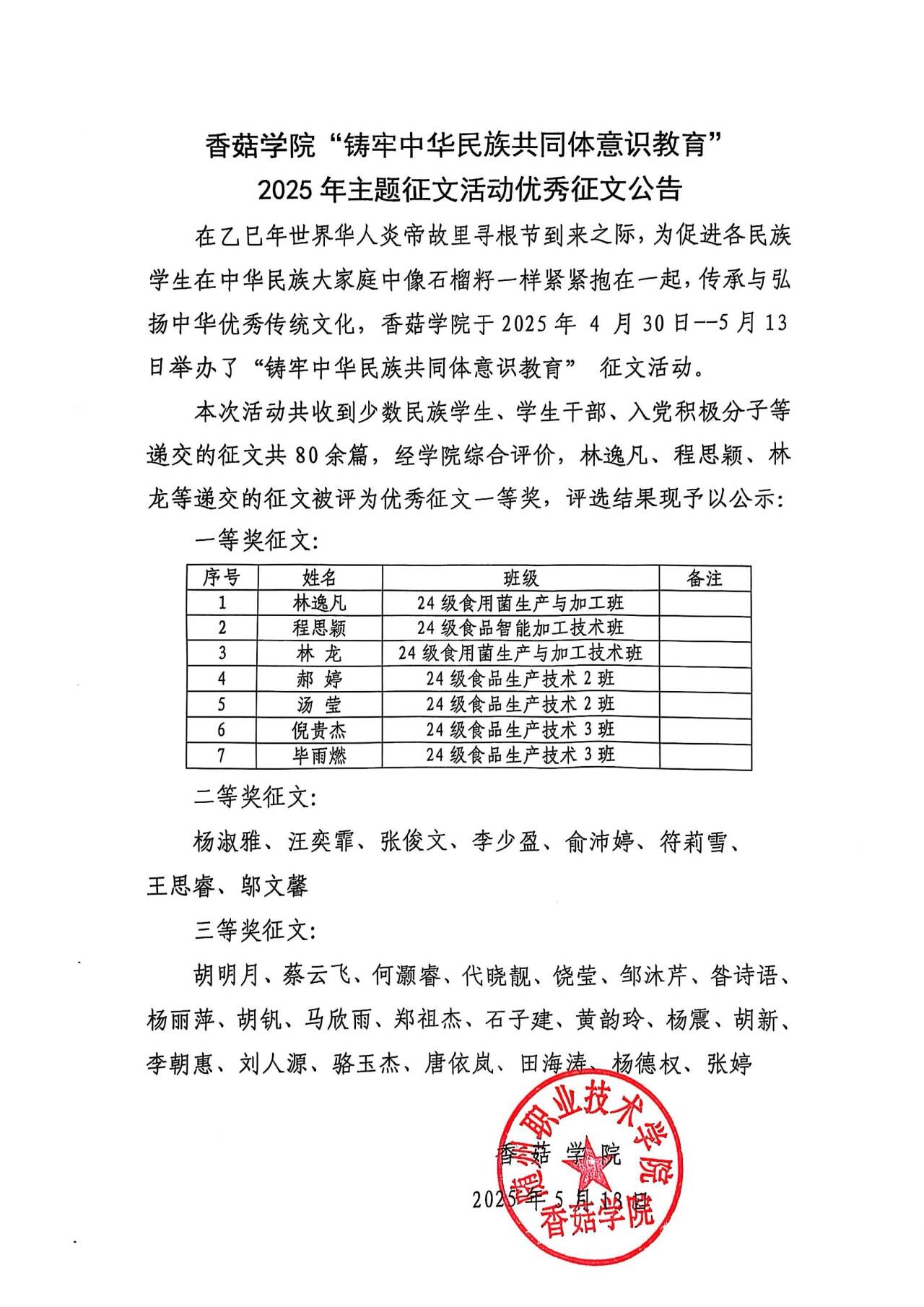 香菇学院“铸牢中华民族共同体意识教育”2025年主题征文活动优秀征文公告